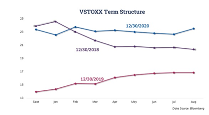 2018年和2020年的曲线在价格水平和形随着时间的推移而下降。2020年曲线的1月合约较现货折价,但2018年曲线较现货溢价。2020年曲线上的1月现货指数较现货指数折价是假期前完成英国脱欧谈判的结果。在之前当脱欧协议未完全确认时,现货VSTOXX和2020年1月合约均处于较高水平。