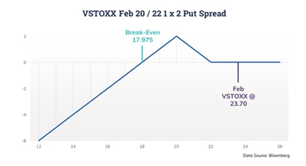 关于该交易的好处之一是,如果市场经历某种波动事件,将VSTOXX推高,根据交易开始时获得的信用,它仍将获得微小收益。该交易的目标是希望2月份结算价非常接近于空头头寸的行权价20点。该交易会在结算价落在18到22点之间获得超额报酬,真正的危险是VSTOXX在2020年的前几周大幅下跌。