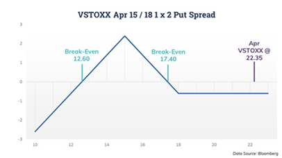 该交易比第一笔交易的情绪更为悲观,但在到期时确实有更大的获利范围。如果4月VSTOXX的到期结算价超过18,则该交易损失每对价差交易0.60点的成本。4月VSTOXX的到期结算价为15时将获得最好收益,获利范围从17.40到12.60。如果VSTOXX在2021年的头几个月经历较大的下跌幅度,该交易将存在亏损扩大的风险。