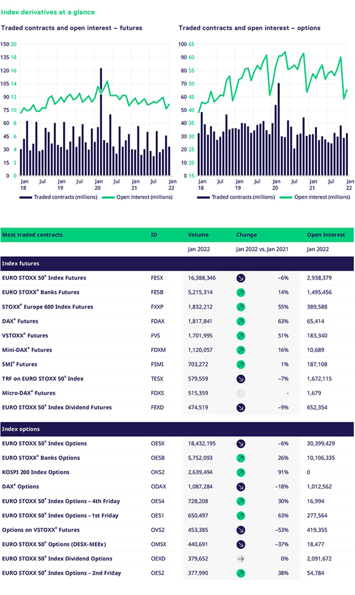 这些市场的错配会产生对对冲的需求,同时也提供了机会。流动性良好的Eurex订单簿在这里得到了充分利用。银行行业期货和期权、KOSPI期权和EURO STOXX 50的每周到期期权都在1月份出现了强劲的交易量。反应整个欧洲股市的STOXX欧洲600指数期货交易量持续大幅增长,传统的DAX、迷你DAX、SMI和VSTOXX等基准股指期货也表现杰出。