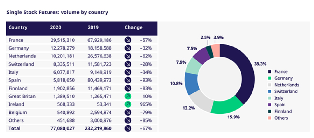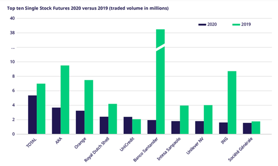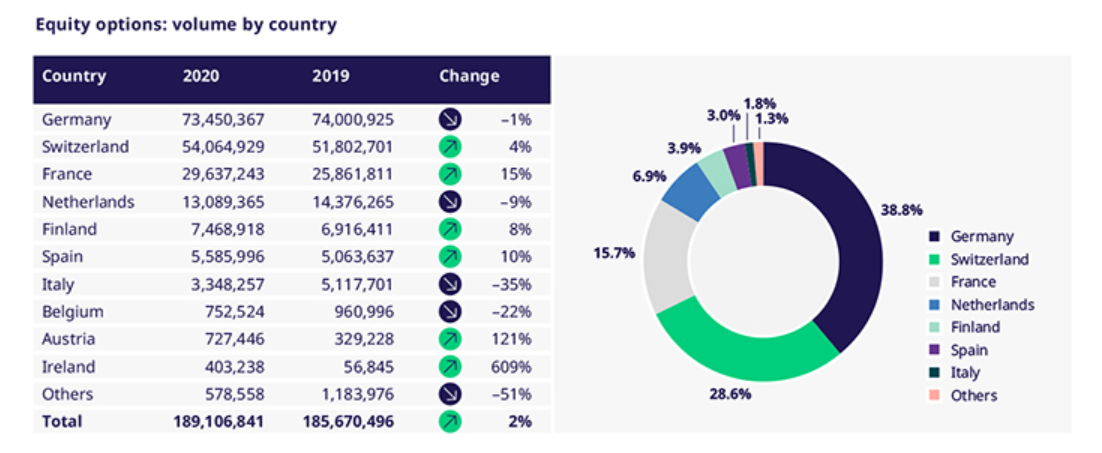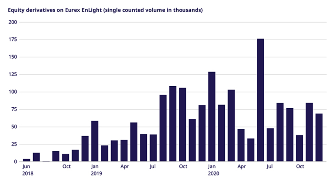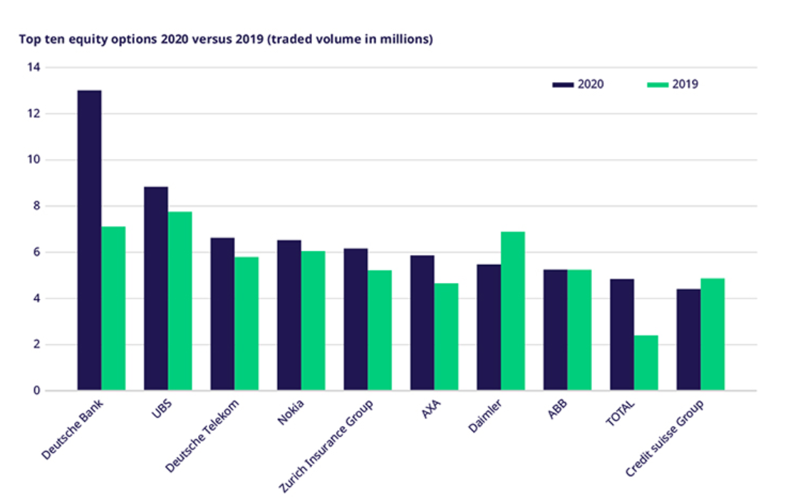 相信大家都会记住2020特别的一年。从市场和股票衍生品的角度来看,2020年可以分为两部分。在上半年,我们体验了一个高波动率和交易运营管理方式的瞬间转变的特别市场环境。对于股票期权业务而言,更具破坏性的当然是年度股东大会的推迟,以及伴随而至的负面影响和股息的减少所带来的不确定性。下半年主要由股票市场的大规模回升主导,首先是由科技板块推动的,在疫苗获批之后又受到周期性和金融板块的支持。在股票期权领域,所有这些市场发展都提供了很多机会,这反映在Eurex 2020年的总交易量增长2%。同时,非常感谢为我们场内外流动性提供商的大力支持,以及他们的突出业绩。多亏了他们,我们才确保了市场秩序井然,良好运转。尽管交易环境很艰难,但仍然吸引了投资者进行大量交易。