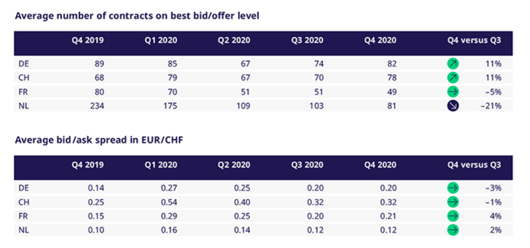 除了去年3月份和 4月份中其中几周的流动性枯竭之外,场内流动性在2020年期间已经相对保持了稳定性。尤其是德国和瑞士市场的最佳买卖价(BBO)报单量已回到与上一年高点接近的水平。