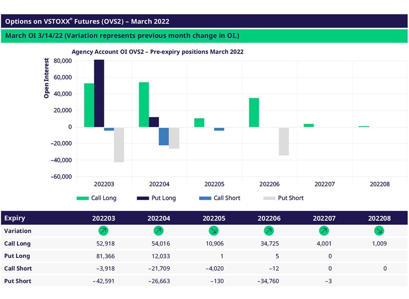VSTOXX®股指波动率指数期货交易在2月底和3月上半月非常活跃。乌克兰战争将波动率指数推高超过40%以上,并加剧了期限结构的逆价差。最活跃的一天是3月4日,有14万份交易合约。3月下半月交易活动放缓。