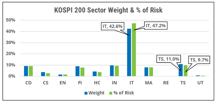 如果将所有的资金都放在KOSPI 200投资组合中,基本上是将所有的鸡蛋都放在信息技术(IT)行业的篮子里。在该指数中,IT资讯类股几乎占43%的指数权重和超过47%的风险,对于一个纯粹的国内投资者来说,IT部门主导了所有其他的回报来源(图1)。再加上电信服务(TS)--第二大行业,在指数组合中占11%的权重和近10%的风险--你就有了一个高度集中的风险,近60%的未来收益波动来自于这两个行业。