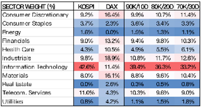 尽管COVID-19疫情危机似乎在从全球感染的疫情转变为个国以地方性疫情方式来处理的阶段,但每一种不断被发现的新变种病毒都比上一种更具传播性,使得卫生保健部门在未来一段时间内有可能仍然是世界上消除此危机的关键。因此,考虑如何减少技术风险时,医疗保健类股可能是一个很好的选项。医疗保健在KOSPI投资组合中只占4%,但在DAX指数中却占10%以上,这给了我们在投资计划中增加这一指数投资比重的另一个理由。
