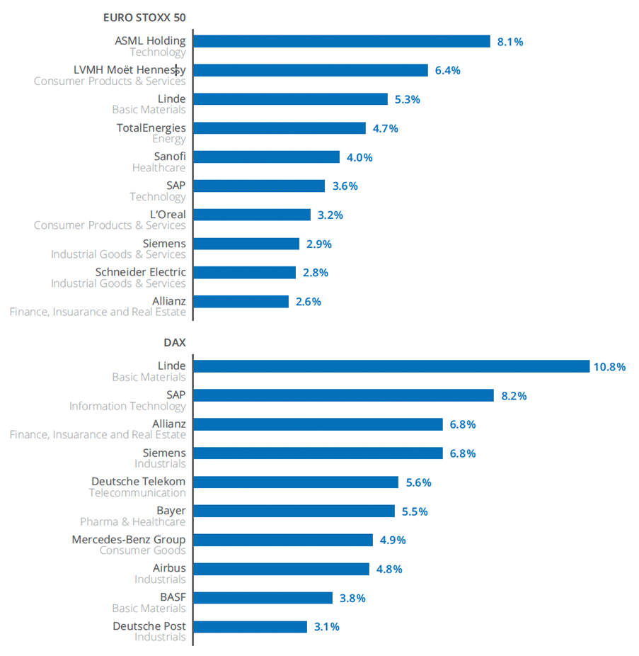 数据来源:Qontigo。EURO STOXX 50指数的数据截至2022年7月29日,并根据行业分类基准。DAX指数的数据截至2022年6月30日,并根据DAX商业分类。
