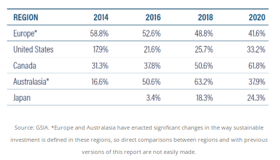 在报告中,美国 ESG 资产两年内增长了 42%,足以补偿欧洲因定义调整而导致的ESG资产下降。GSIA 表示,截至2020年底可持续投资占全球管理的总资产的 35.9%,高于 2017 年底的 33.4% 和 2015 年底的 27.9%。