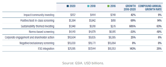 ESG要素整合—将 ESG 要素系统地、明确地纳入财务分析中——取代之前流行的负面或排除筛选的投资标的选择,已成为GSIA提到的七个投资策略中最受欢迎的一个。据GSIA 报告显示,截至 2019 年底,ESG 整合的投资策略资产管理规模约25.2 万亿美元,高于两年前的 17.5 万亿美元。