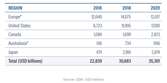 GSIA在 7 月 19 日发布的第五次双年“全球可持续投资审查报告”中表示,环境、社会和治理 (ESG) 战略的投资从2017年底的 30.7 万亿美元跃升至2020年底的 35.3 万亿美元,其增长超过了专业管理行业总资产在同期取得的7.2%的速度。