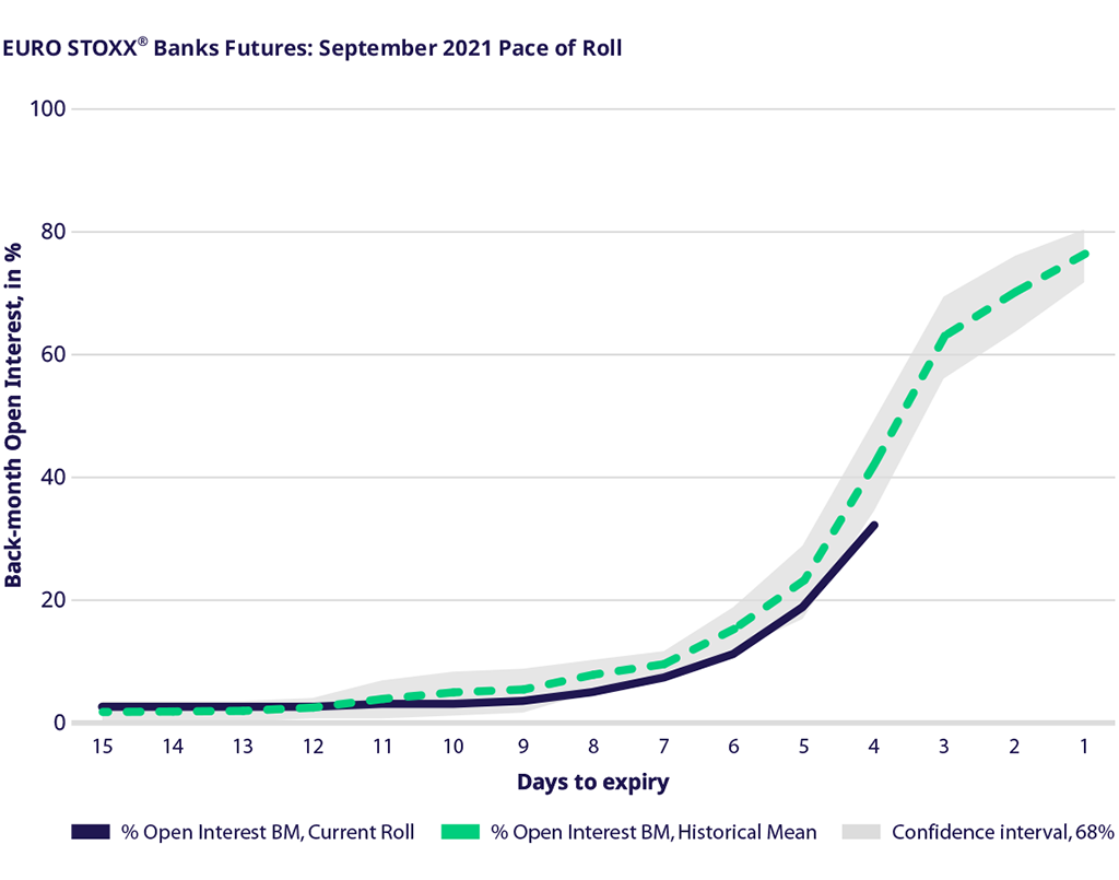 欧洲STOXX®银行类股指数期货的展期合约交易较为平稳,展期合约在期货合约到期前9个交易日开始密切交易。截至目前,9月的展期合约交易量处于历史平均交易量的较低水平,大部分交易活动集中在距离合约到期日的最后一周。截至周一结束,市场上已经有近32%的未平仓合约展期至最远月,另外40%的未平仓合约将在本周展期。