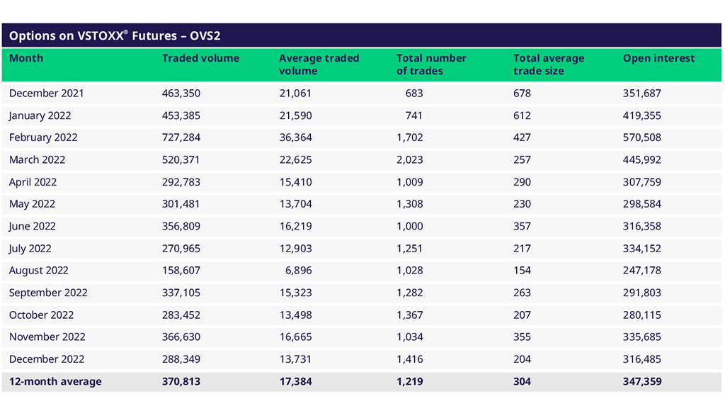 在2022年,VSTOXX®期权也受乌克兰战争的影响。除期货之外,从2022年3月开始成交量急剧下降。日均交易量已经从20,000 - 30,000下降到10,000 - 15,000。2022年12月的未平倉量与2021年12月的水平相同,但成交量明显较低。该产品仍然被廣泛用作長線持有,並每月换月展仓。頭寸几乎没有轉勢,显示投资人对于市場未来表現预期为平稳。