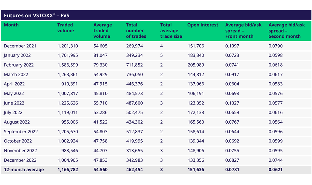在12月,VSTOXX®期货的交易活动继续橫盤,日均交易量48,000手(11月为45,000手)。最活跃的一天是12月15日,交易量达到131,000手。未平倉合約數仍处于较低水平。