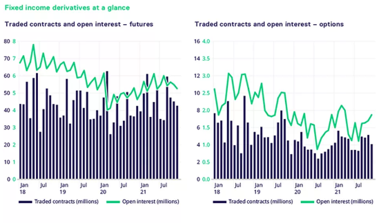 與2020年相比,期貨相關產品的交易量年增率增長了13.6%;而德國長期國債(Bund)和德國中期國債(Bobl)期貨分別增長了16.2%和17%。相對於殖利率曲線的其他部分,曲線的近端表現不佳,德國短期國債(Schatz)期貨的交易量年環比下降了9.6%。意大利和法國板塊有著持續穩健的同比增長,10年期板塊年環比增長分別為21.3%和28.3%。意大利曲線近端的交易量與2020年相比增長了15.6%。目前來看2022年面臨的主要問題與2021年一致,通貨膨脹仍然是一個棘手的難題,所以中央銀行會加速實施收緊政策。這給各國央行帶來了加息的壓力,英國在2021年末加息,而美聯儲預計將在2022年加息。這種分歧,再加上潛在的股價回測的風險,增加了市場上的波動性。