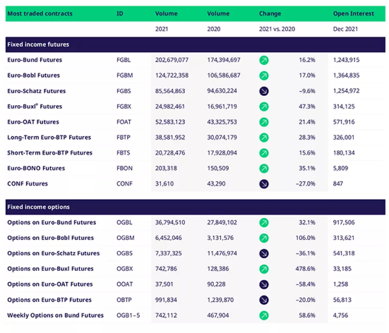 首先,在開始回顧2021年之前,我想先用一點時間來感謝我們的成員和終端客戶在這一年中對我們的支持。正是因為你們對我們現有的投資組合和新激勵方案的持續支持,才為我們創造了2021年紮實的業績。去年有著一個非常不錯的開始,公債殖利率曲線的長端為投資者提供了許多早期的機會。德國長天期國債(Buxl)期貨和期權出現了兩位數的增長,同比分別增長了47.3%和478.6%。