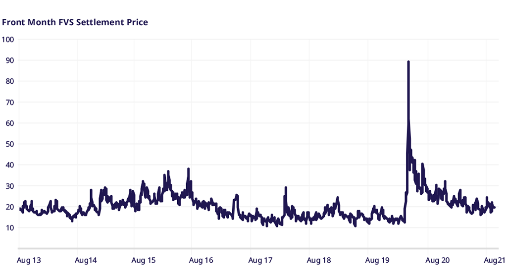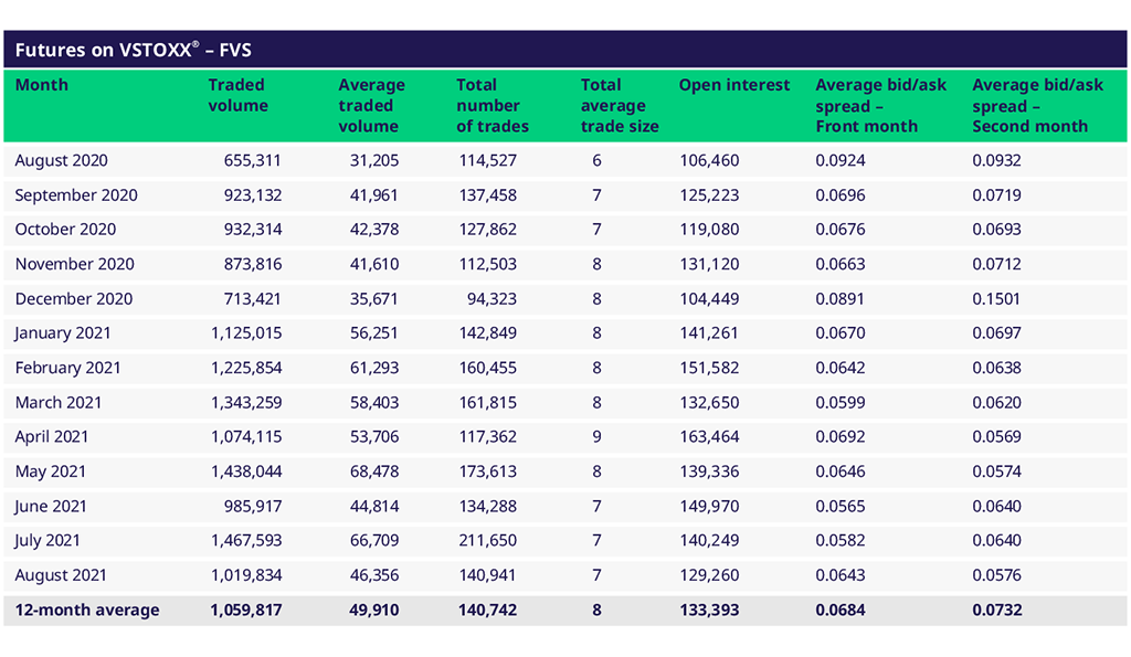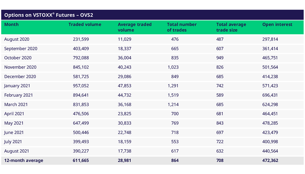 與7月相比,8月的VSTOXX®期貨市場表現較為平靜。交易量最大、最活躍的一天是8月16日,當天共交易了9.4萬手合約。