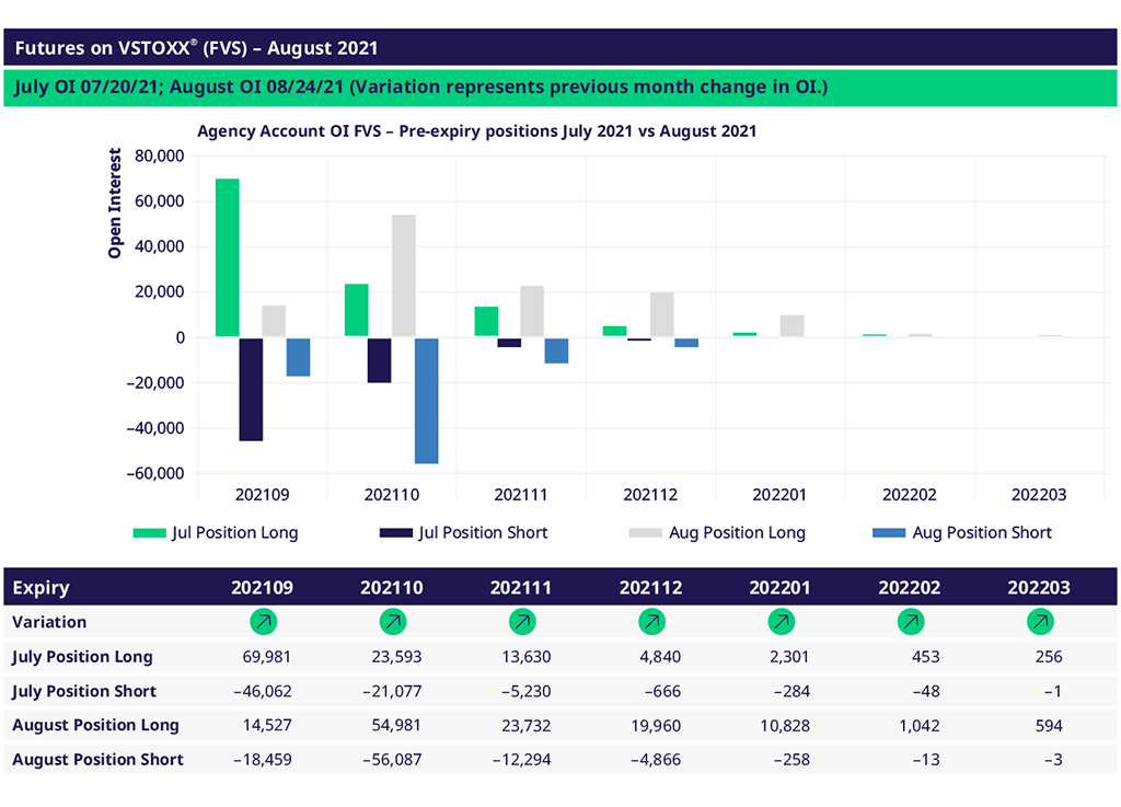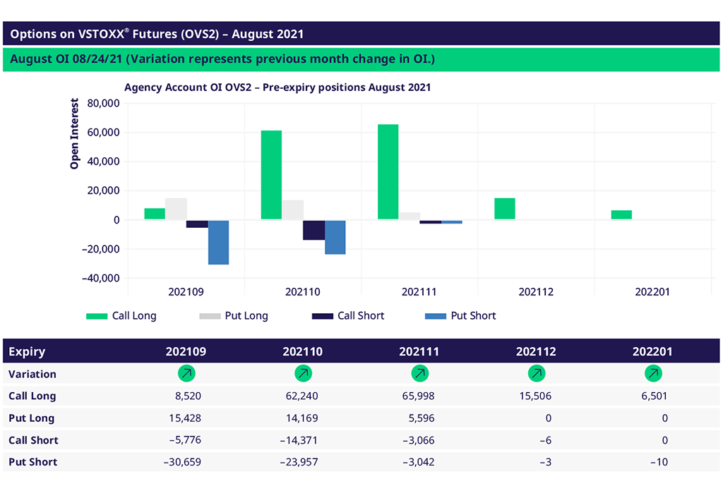 VSTOXX®期貨選擇權的成交量趨於平緩。未平倉的合約量增加了10%,達到了44萬。 9月的多頭看漲敞口更為明顯。