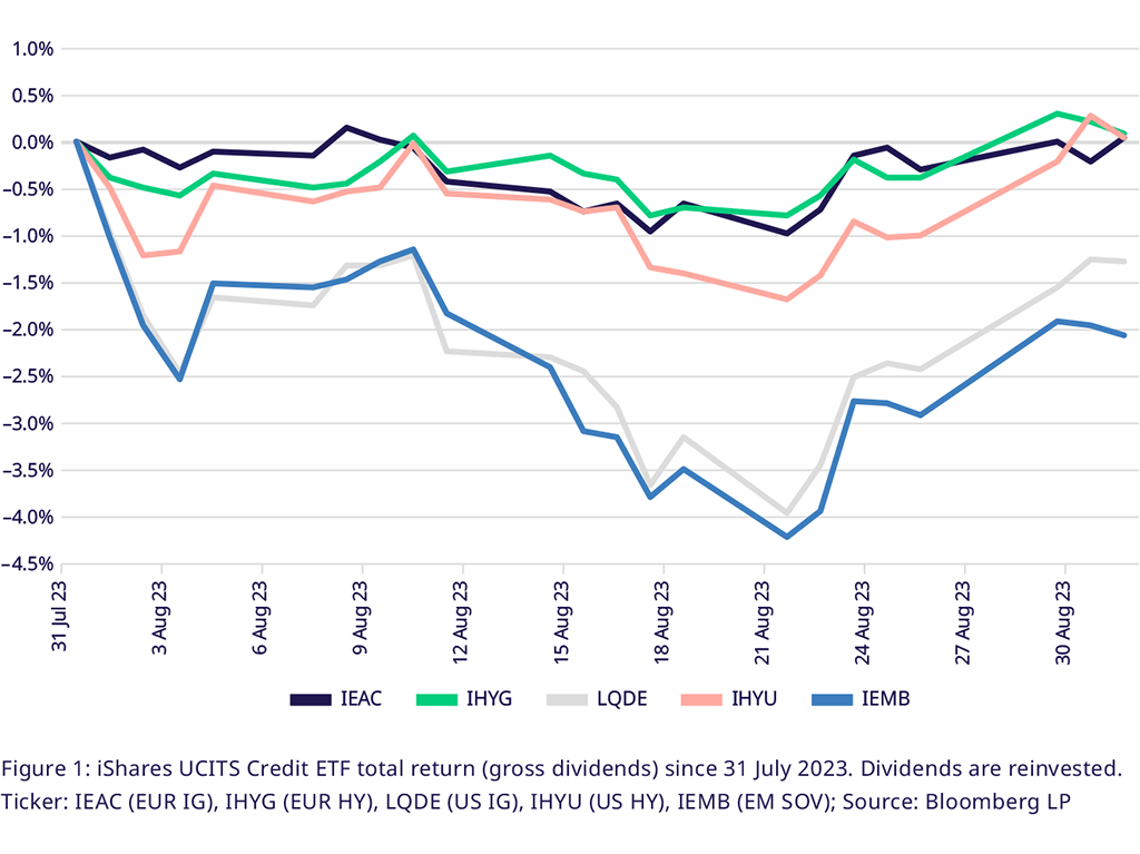 Amid low trading volumes, August saw credit ETFs realize their carry amid bouts of volatility in both credit spreads and yield curves. However, sovereign curves in the US and Germany behaved in distinct ways, with the US curve bear-steepening, while the German curve further bull-flattened. In the US, the long end of the curve rose a maximum of 28bps over the month, before recovering for a total rise of 14bps in August. The long duration Emerging Markets Sovereign Credit UCITS ETF IEMB and US Investment Grade UCITS ETF LQDE lost 2.05%, 1.27%. The short end of the curve being less impacted and higher carry led to the low duration US High Yield UCITS ETF IHYU staying flat. In Europe, the curve movement supported asset performance, combined with carry from the embedded bonds. However, spreads widened and kept total return flat. Both IEAC (EUR IG) and IHYG (EUR HY) closed the month with a total return of less than 0.1%.