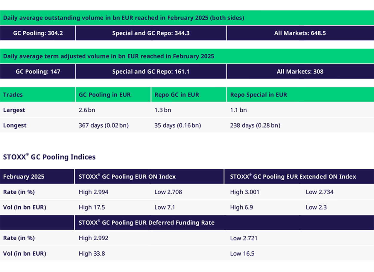 In February, the term GC Pooling market experienced active trading across all standard terms from 2 weeks to 12 months in both the ECB and ECB Extended baskets. The ECB MAXQINT basket also saw active trading from 2 weeks to 3 months.