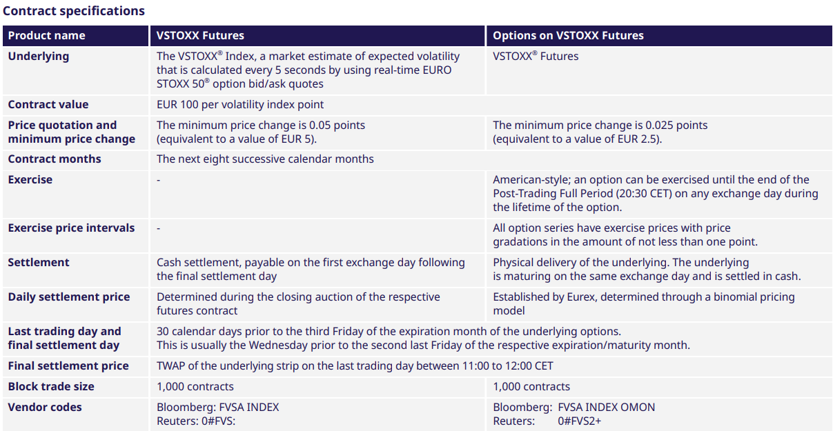 Underlying | The VSTOXX Index, a market estimate of expected volatility that is calculated every 5 seconds by using real-time EURO STOXX 50® option bid/ask quotes. | VSTOXX Futures |
