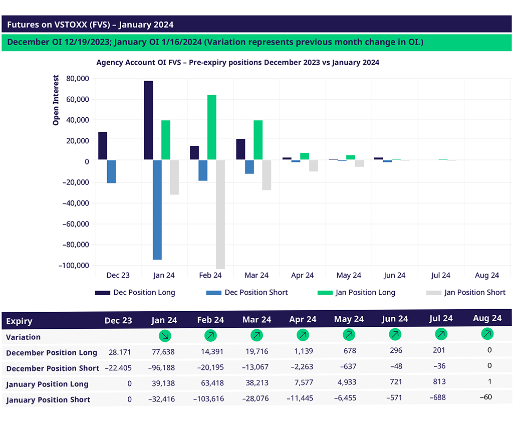 January was a notably active month for VSTOXX® Futures, with Open Interest hitting a 12-month high at over 215k contracts. ADV hit the highest since October, with over 1.278 million contracts traded, driving average daily volume to 58,115 contracts. Screen liquidity remained elevated, with the average bid/ask front month spread the tightest in over a year and the second month spread meaningfully tighter than average. 16 January saw the heaviest trading day for VSTOXX® Futures, with over 102k contracts trading. As of the JAN expiry, the FEB contract Open Interest attributed to A-accounts increasing its short bias, yet A-accounts stayed slightly net long in the MAR contract. Activity further out the curve continues to tick higher as we approach election season globally.