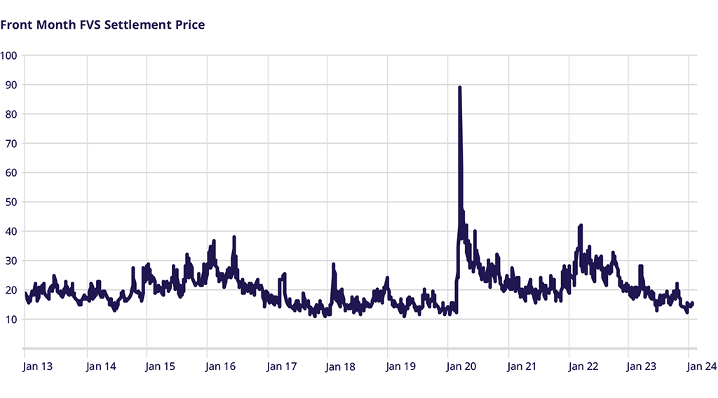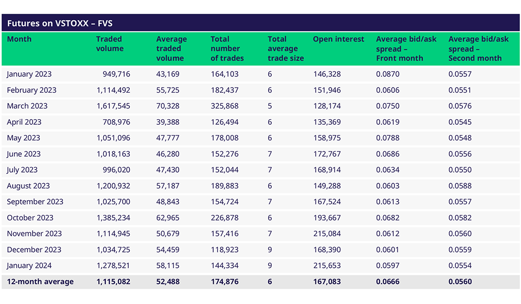 Ahead of 40+ national elections this year and heightened geopolitical uncertainty, screen markets for Options on VSTOXX® Futures (OVS2) are now roughly 50% tighter on the back of revised market-making requirements that came into effect 1 February. In January, OVS2 volumes were lighter than average. However, Open Interest ticked slightly higher from December. As with futures, 16 January was the heaviest trading day, with over 35k options trading.