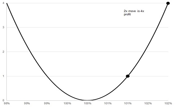 While the original S&P100 VIX was a significant innovation in 1993, the product became almost immediately out-dated as variance swaps were also launched at a similar time. Variance is the square of volatility, which makes variance a difficult concept to understand. However as the pay-out of a delta hedged option is variance, not volatility, variance is mathematically the correct measure of deviation. This can be seen in the diagram below, which shows that a delta hedged option makes 4x the profit when you double the stock price movement. If the payoff of an option was based on volatility, not variance, then a delta hedged option would make 2x the profit when you double the stock price movement.