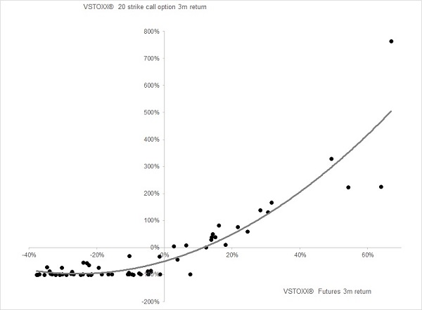 Investors who wish to be long volatility are normally expecting a volatility spike. While volatility futures will be profitable in the event of a volatility spike, call options on volatility could be significantly more profitable as they offer geared exposure to any volatility upside. The chart below shows the 3 months return for VSTOXX® 20 strike (i.e. roughly ATM) call options against the 3 month return for the identical maturity VSTOXX® Future. As can be seen, the profits on a long VSTOXX® call option can be up to 10 times larger than profits on VSTOXX® Futures. This additional exposure to volatility spikes comes at the cost of a far larger average loss (24%) than the average loss on VSTOXX® Futures (6%) over the 3 month period.