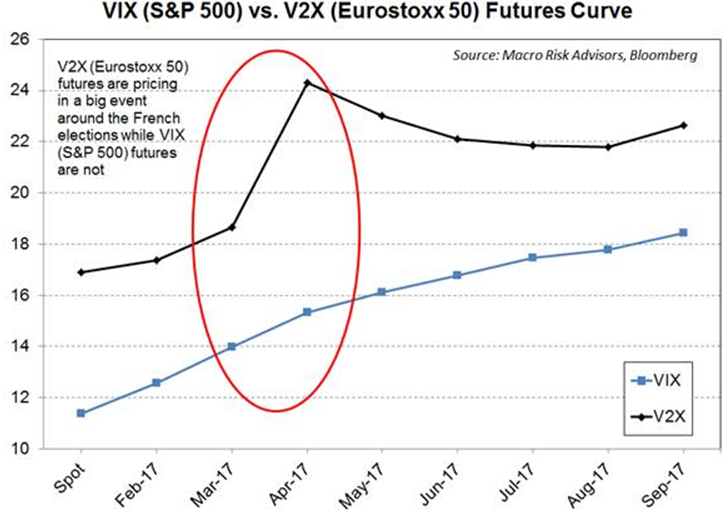 He said the disparity between the VSTOXX and the VIX was interesting. “If France is moving towards an E.U. exit and maybe even a euro exit, that isn’t just a European issue, it’s a global issue,” he said. “Remember how the SPX reacted when Greece almost exited? Obviously France in many ways sits much more centrally within Europe than Greece ever did.”
