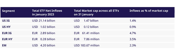 Risk capital has started to enter credit markets. Credit ETFs see significant fund flows, with most flow moving into less risky tranches and US ETFs exhibiting the highest market penetration. In the US, investment grade focused funds saw $21bln of new investments, while high yield focused funds saw inflows of around $1bln, slightly less than the 1% of the total market cap ($118bln) of all US high yield ETFs on Jan 31st. ETFs on European Investment Grade bonds saw a net inflow of €2.9bln between Jan 1st and Jan 30th, an addition of 4.7% of the total market cap on Jan 31st. European high yield ETFs, still a nascent market, saw inflows of €276mln, contributing 3.5% to a total of €7.86bln.